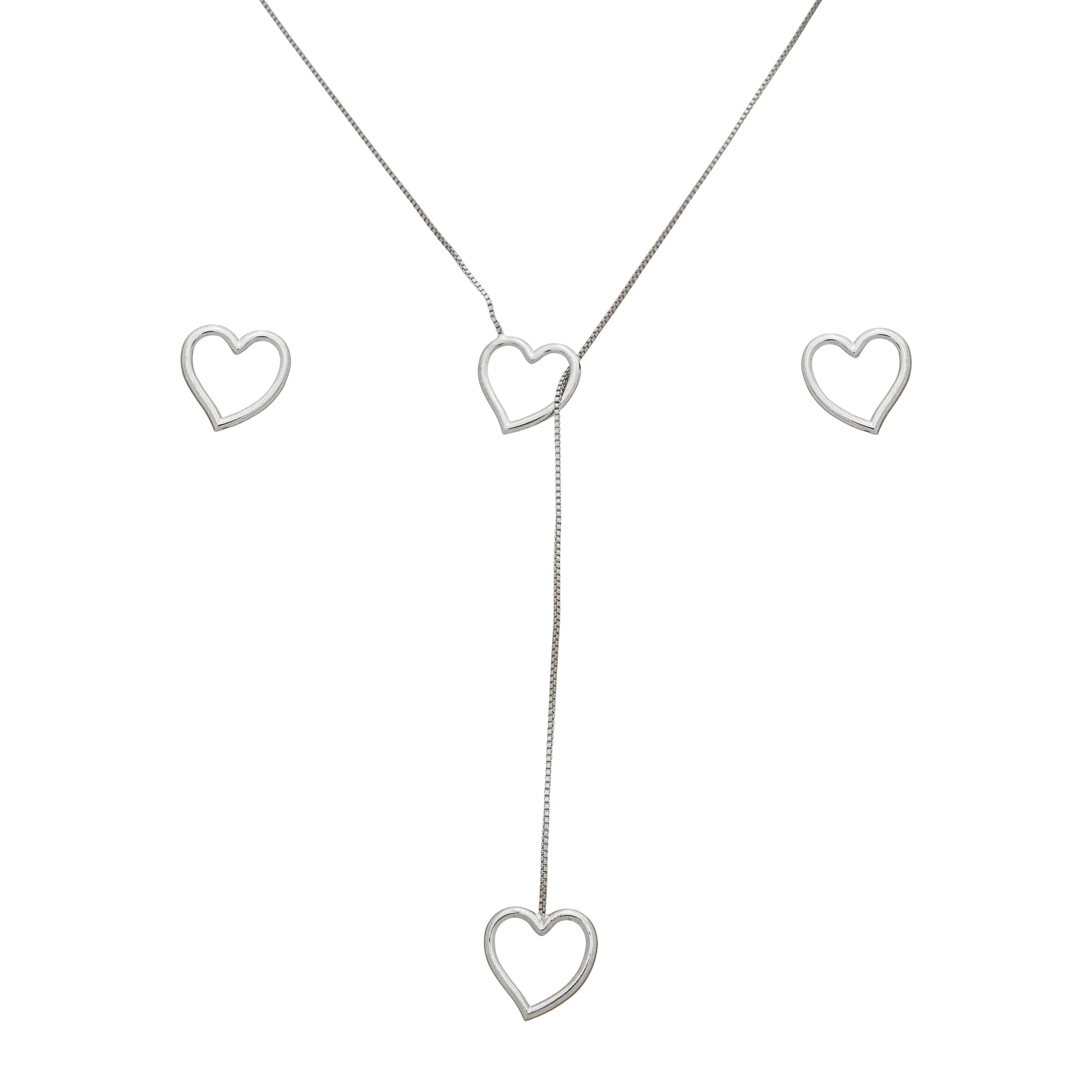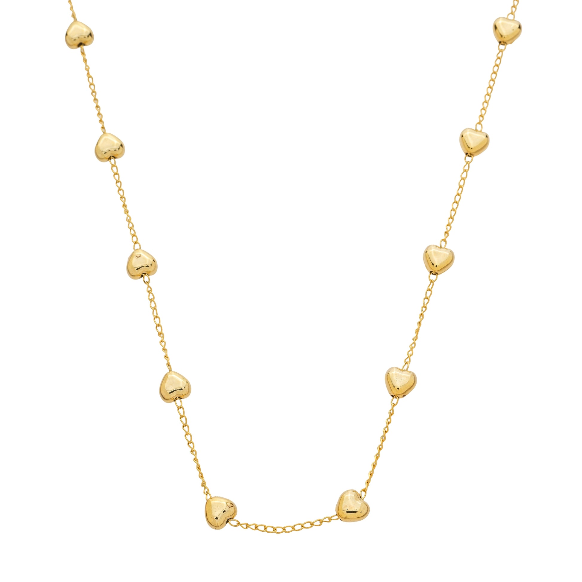 Colar longo delicado com pingentes de coração dourados distribuídos ao longo da corrente. Peça romântica e elegante que traz charme e sofisticação ao seu visual.