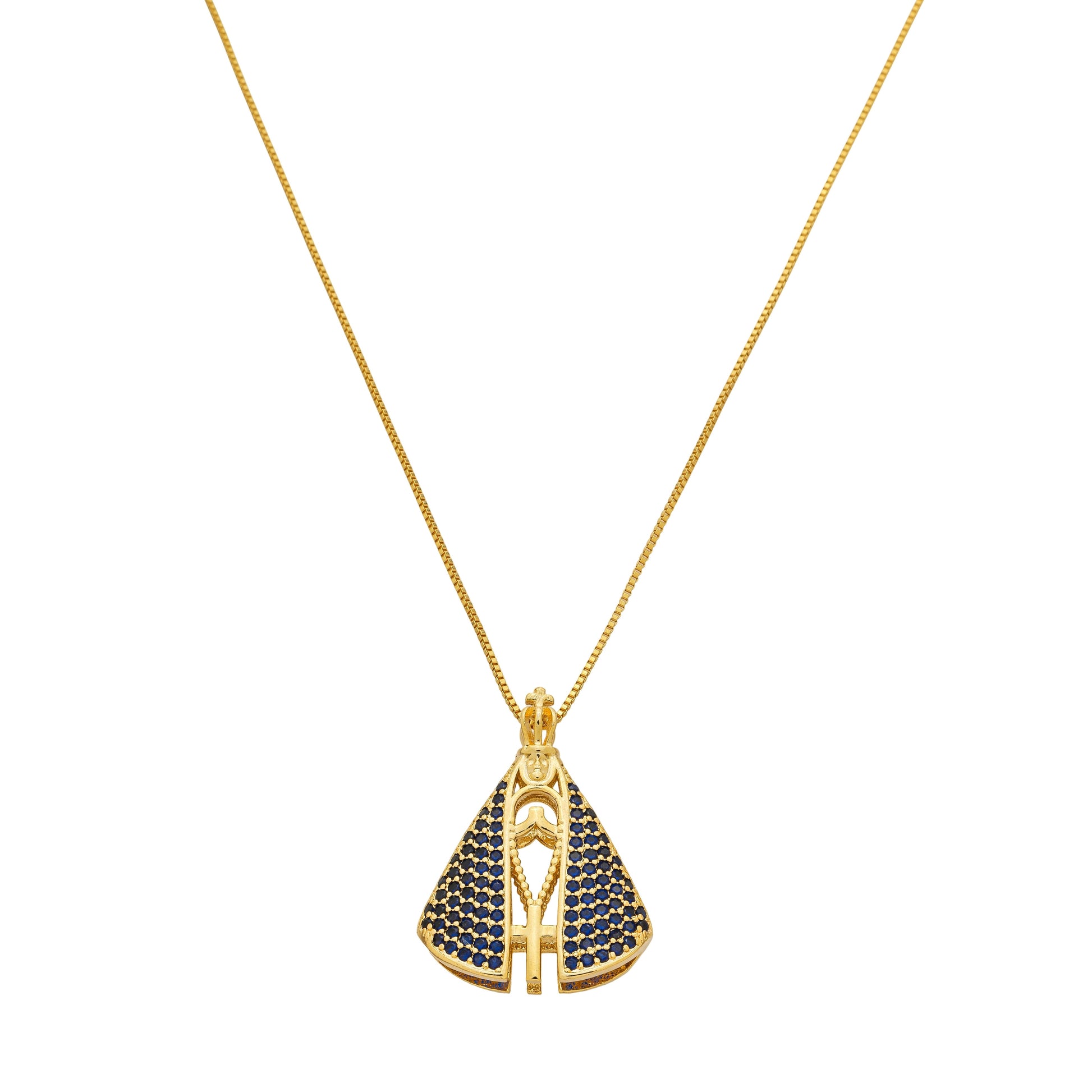 Lindo colar com pingente de Nossa Senhora, confeccionado em material de alta qualidade com detalhes em pedras azuis. Uma peça elegante e significativa para uso diário ou ocasiões especiais.