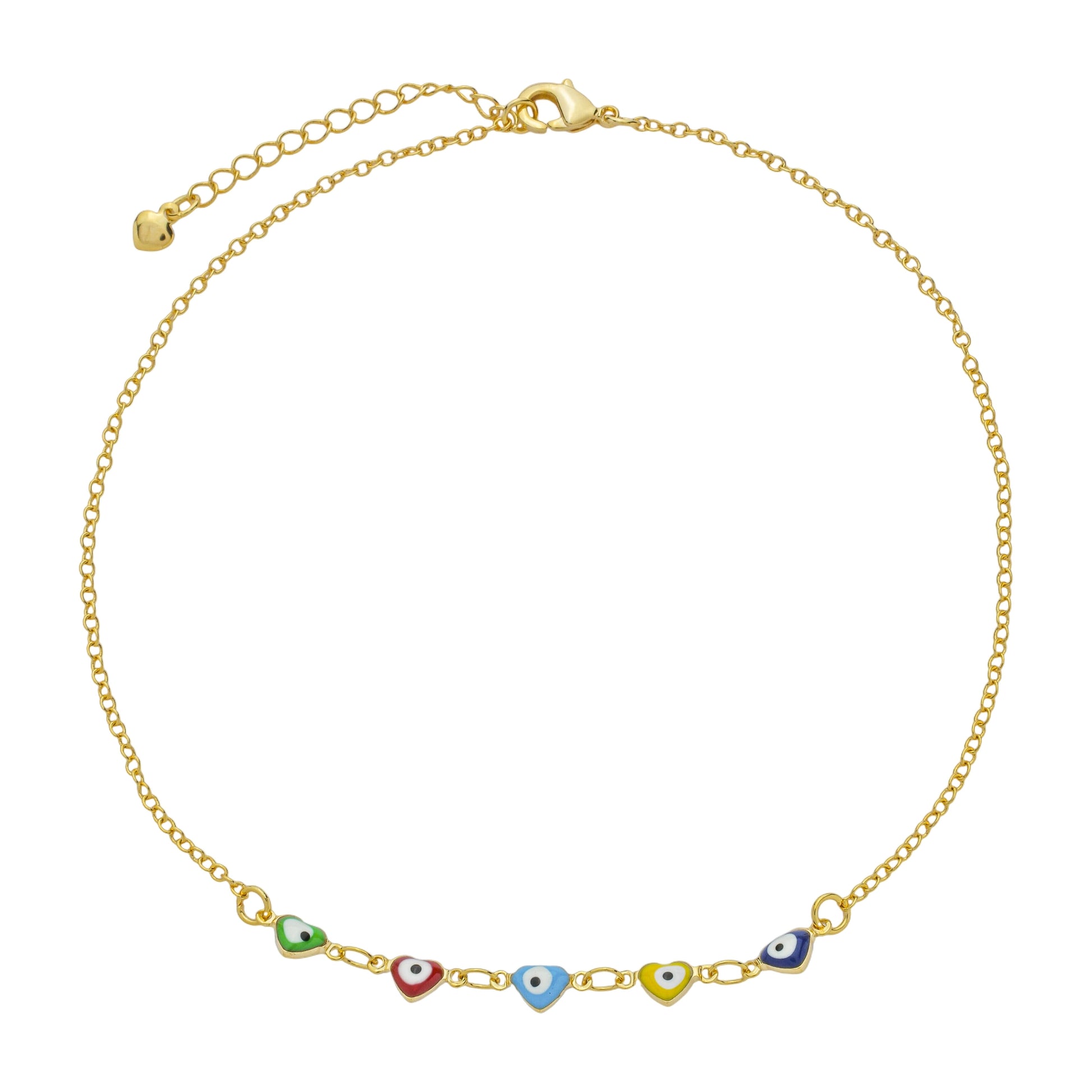 Tornozeleira delicada com pingentes de olho grego coloridos. Peça charmosa que traz proteção e estilo, perfeita para adicionar um toque especial ao seu visual.